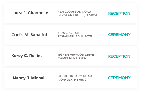 Build your free wedding guest list, collect mailing addresses and RSVPs. Customize your guest list by adding new customer and invite them. You can relabel or delete any guest which them you don't need.